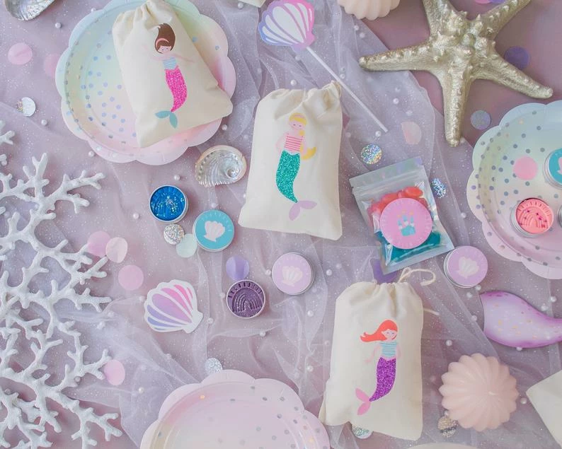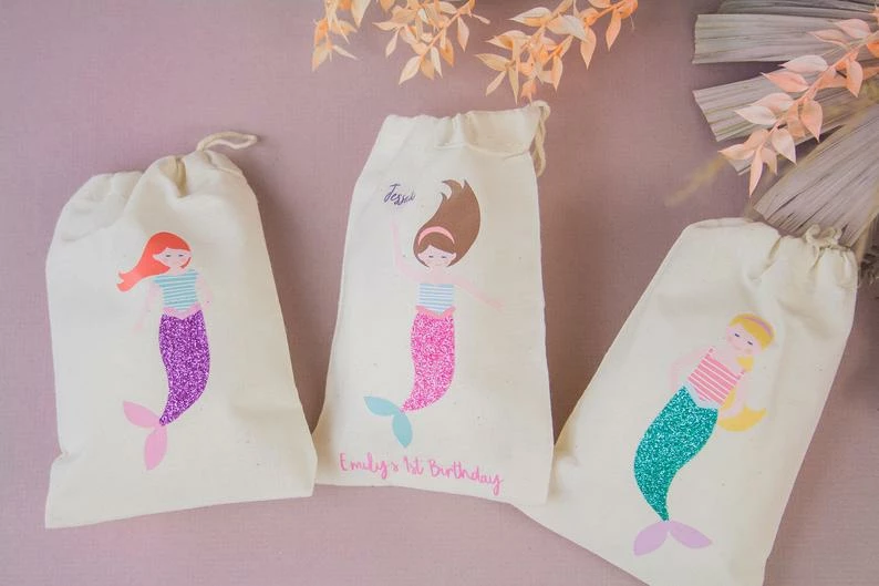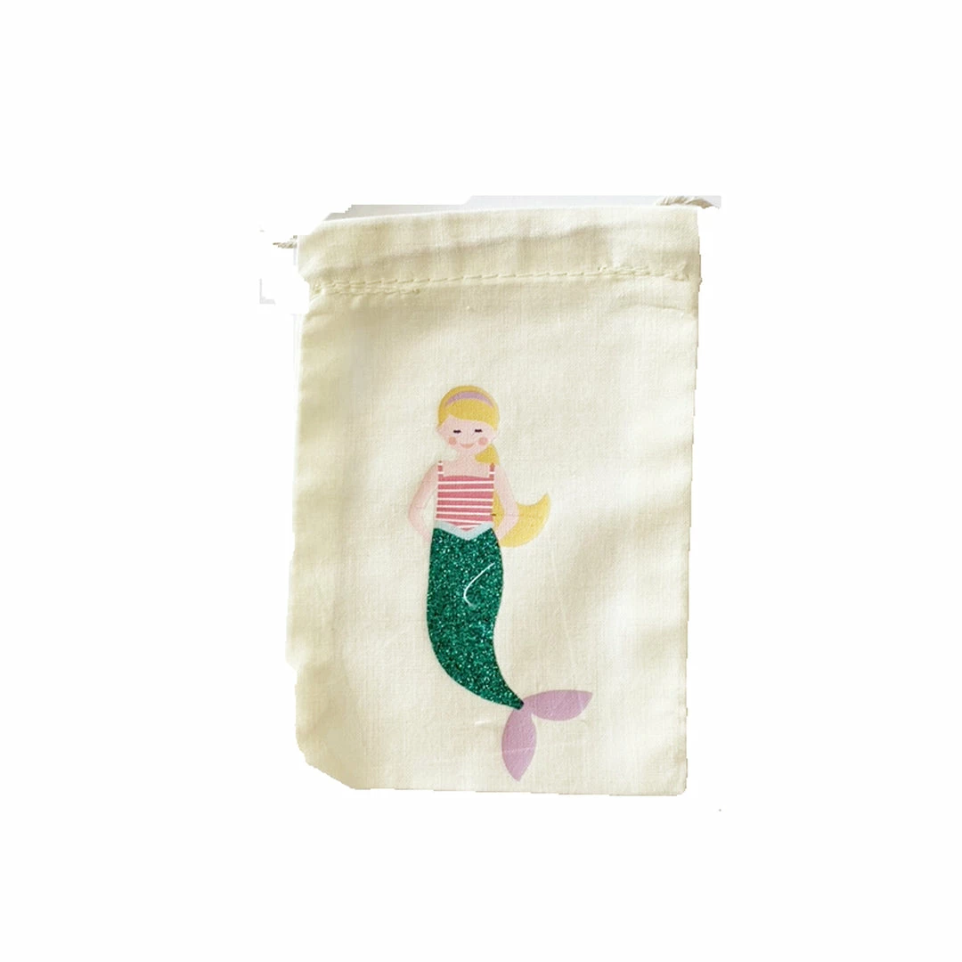 Perfect for little mermaids, each of these Mermaid party bags are made from 100% cotton muslin and feature 3 gorgeous mermaids with the sparkliest glitter tails.