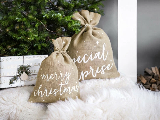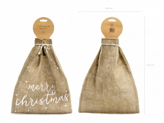 Pack includes 1 x Hessian Gift Sack with white print and inscription Merry Christmas.