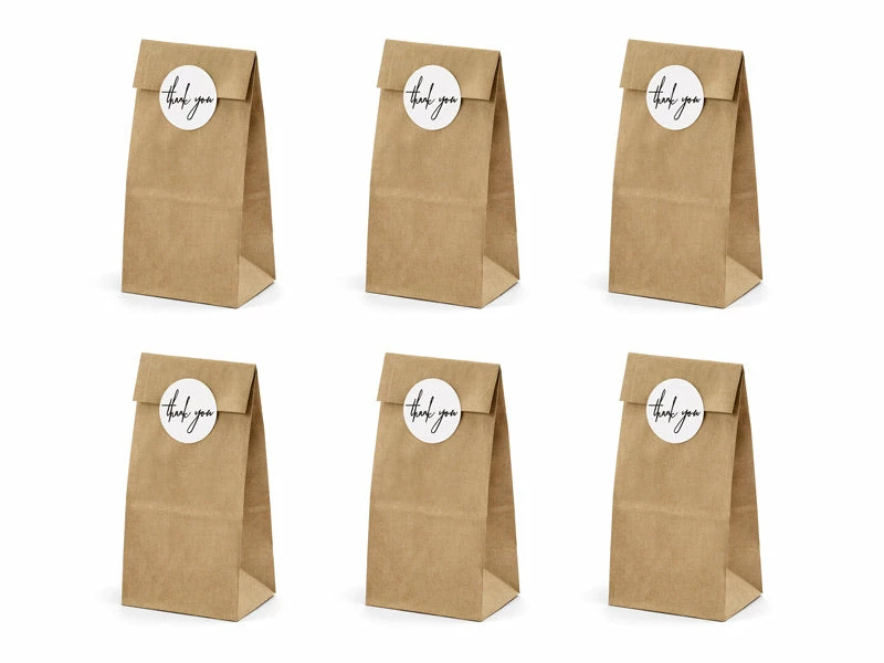 Pack includes 6 x kraft paper party bags with 6 white circle thank you stickers.