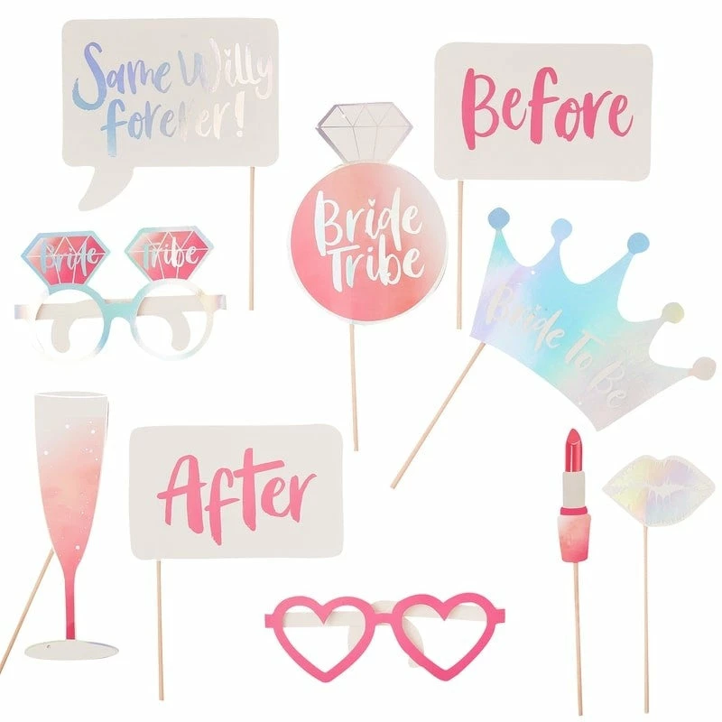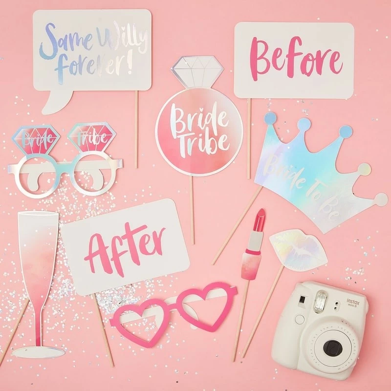 Place our photo booth props around your party venue so hens can take gorgeous photos – memories they will look back on with the bride to be forever. The Bride Tribe props are super cute and fun – everything you need for a laugh at your hen!