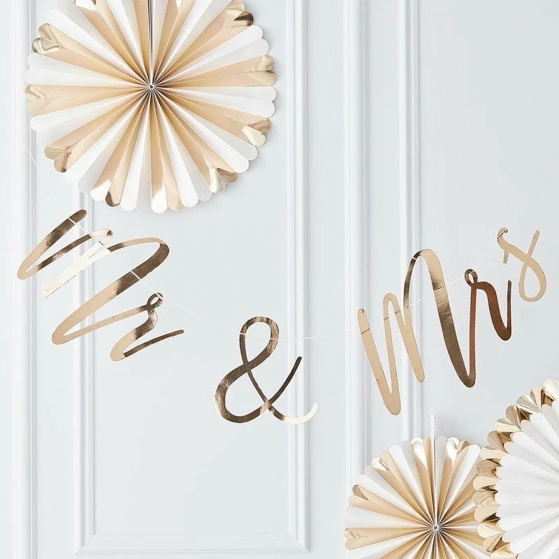 Package includes a gorgeous 2 metre gold Mr & Mrs bunting.