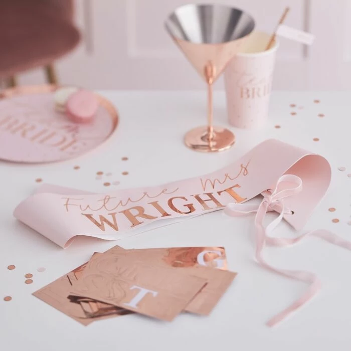 A beautifully packaged blush pink Future Mrs sash with a velvet ribbon.