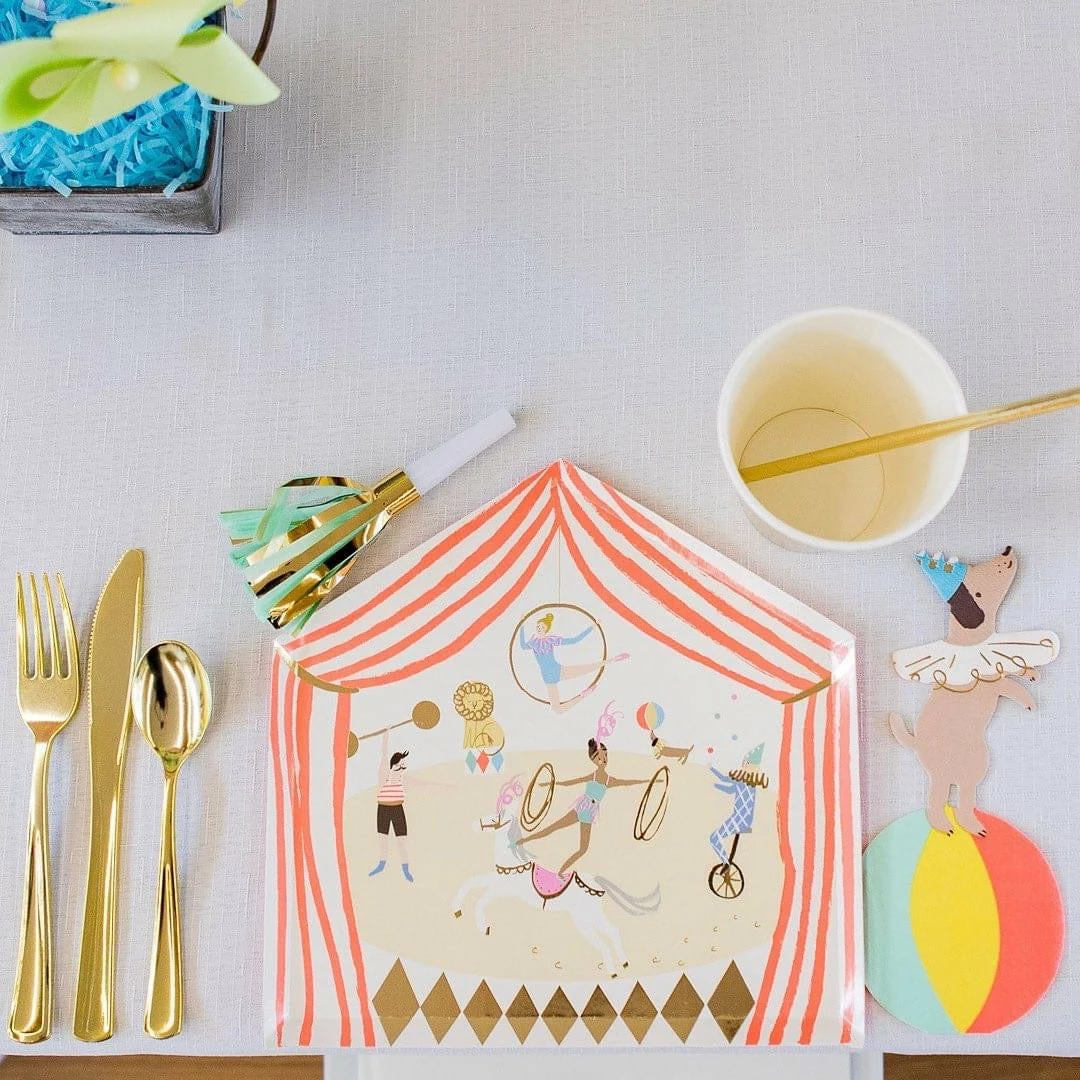Each napkin features a cheeky dog balancing on a colorful ball wearing a funny hat with gold foil detail.The perfect napkin for a circus or carnival themed party.