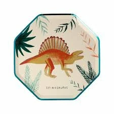 Set the scene with these roarsome dinosaur foil detailed plates with illustrations of famous dinosaurs. with copper and green foil detail.