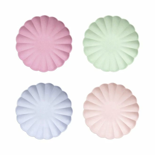 These molded scallop shaped plates are crafted from wood fiber, bamboo and sugarcane, and are dyed with water-based inks. A multicolor selection of our wonderful eco party plates suitable for a range of stylish celebrations.