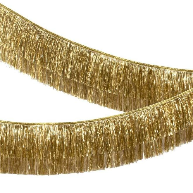 Each pack contains a double layer gold metallic tinsel fringe garland with gold ribbon ties. Product length is 1.8 metres.