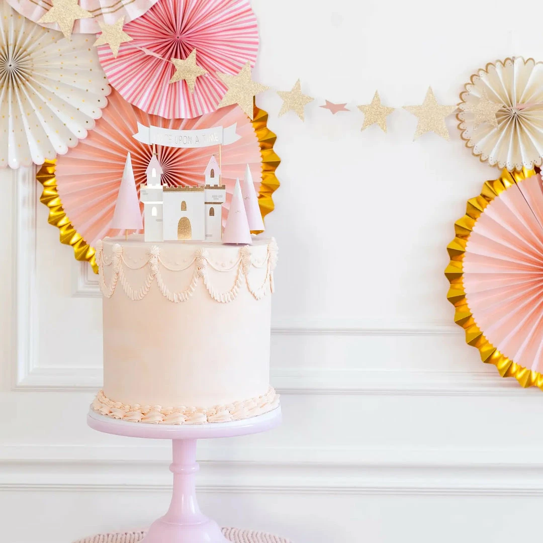 Create a cake fit for a fairy tale with this magical cake topper set! Included are castle pieces, mountains and a “Once Upon a Time” banner that will make any cake a the perfect addition to any princess party.