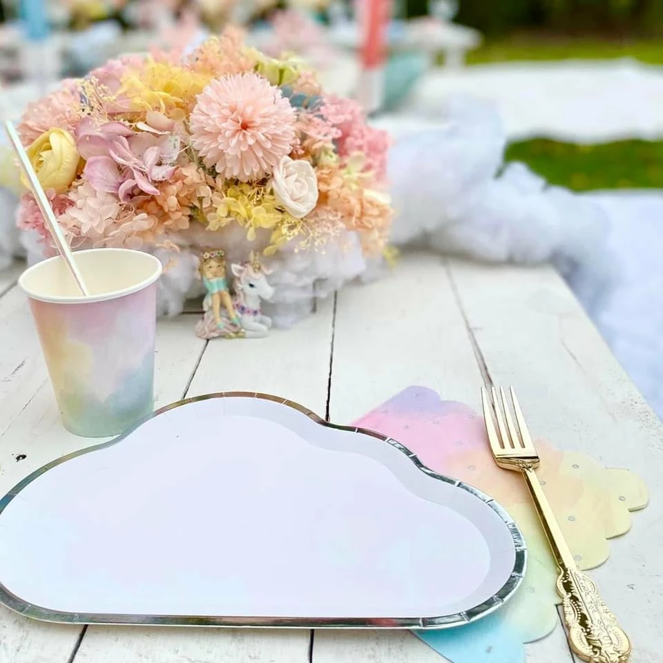 Package Includes 8 Silver rimmed cloud shaped paper plates.