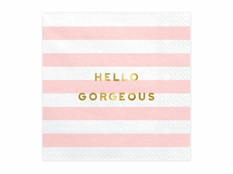 Package includes: 1 x 20 white and light pink Striped Paper napkins with gold foiled inscription ‘Hello Gorgeous’