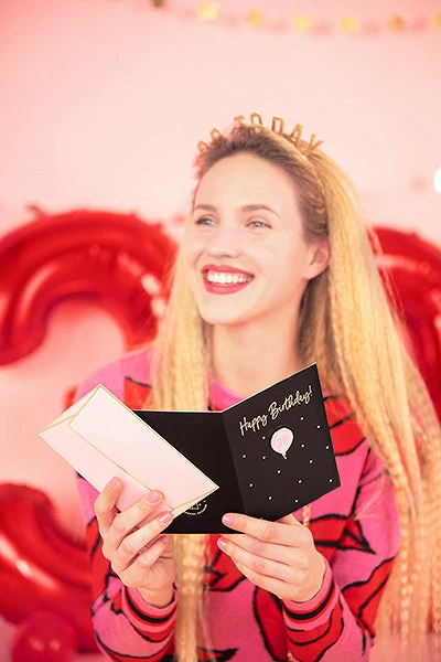 Package includes 1 x Black Birthday Card with Stunning Gold Foil Dots and Happy Birthday Message on Front of card. Attached to the card is a pink enamel pin in shape of balloon with a shiny gold border and 30 inscription.