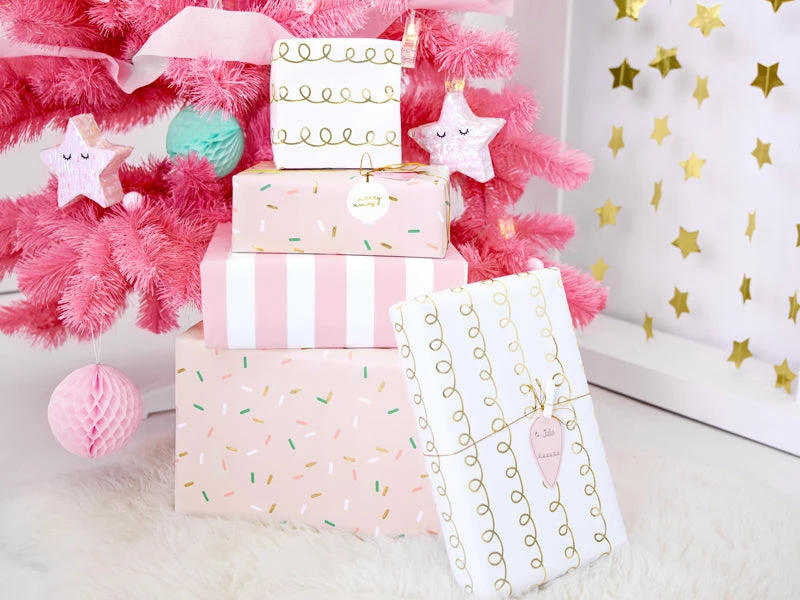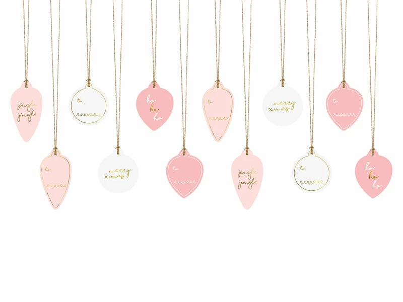 Package includes 12 gift tags made of pink and white card stock and 4 m of gold string. The set contains 6 different designs, (2 of each).