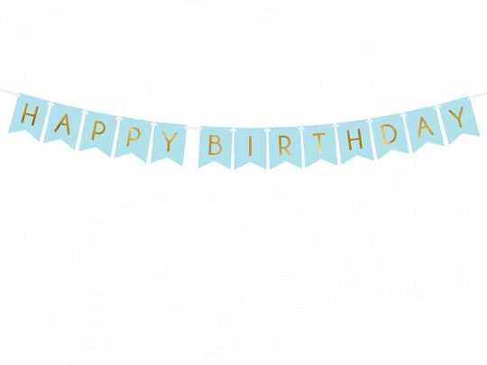 13 Bunting Flags with Gold Print to spell a Happy Birthday message.