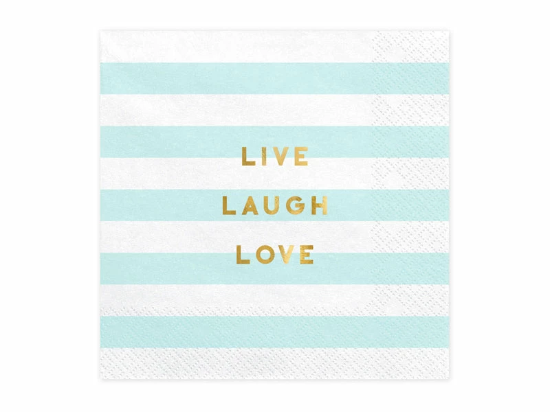 Package includes: 1 x 20 white and light blue Striped Paper napkins with gold foiled inscription ‘LIVE LOVE LAUGH’