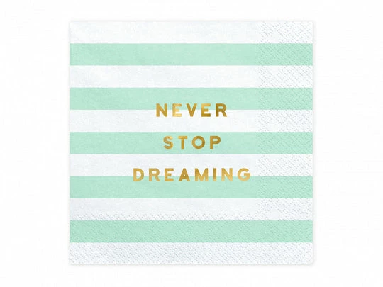 Package includes: 1 x 20 white and light mint Striped Paper napkins with gold foiled inscription ‘NEVER STOP DREAMING’