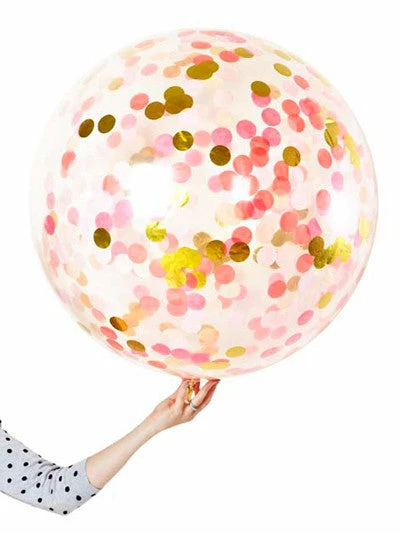 Package includes one 90cm Giant Crystal Clear Balloon filled with pink and metallic gold Confetti and crepe fringe.